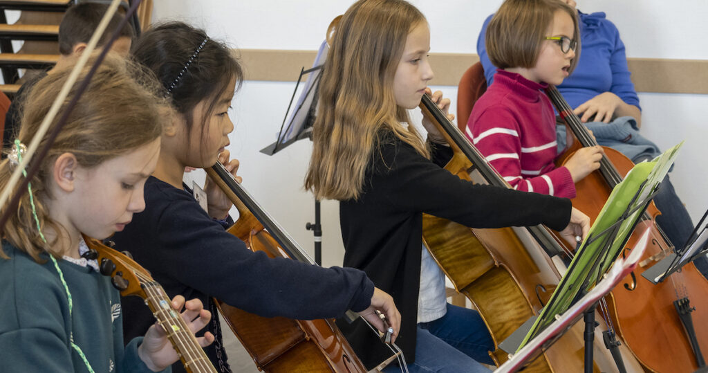 Jouer collectivement, c’est aussi être capable de s’écouter soi-même tout en écoutant les autres, ce qui permet d’ajuster son jeu à l’ensemble. Cela peut paraître compliqué au début, mais au fur et à mesure, cette oreille polyphonique se développe et le plaisir qui lui est associé est décuplé ! Parfois, un musicien peut être dérangé par le fait de ne pas s’entendre jouer, au sein d’une vaste masse sonore, c’est notamment le cas des instrumentistes à cordes qui sont plus nombreux au sein d’un même pupitre… mais là encore, il s’agit de réflexes et de repères à acquérir.